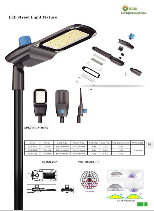 | EK-BL04(S) | 618*230*116 | 20w-80w (ලාම්පු කණුව 60mm) | ඇලුමිනියම් නිවාස, ටෙම්පර්ඩ් වීදුරු, රබර් මුදු, ඉස්කුරුප්පු |